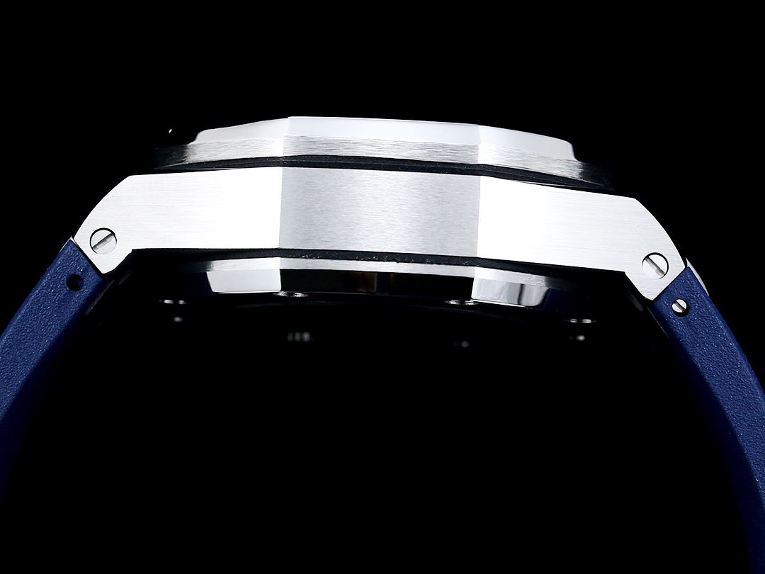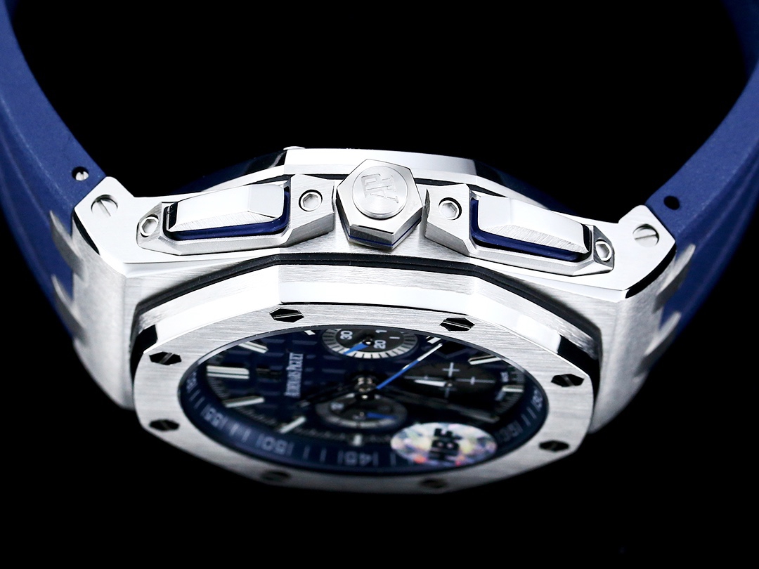 The titanium case of this 42mm Selfwinding Chronograph is enhanced by a blue “Méga Tapisserie” dial and a blue rubber strap. Titanium case, glareproofed sapphire crystal, titanium bezel, push-pieces and screw-locked crown, titanium pushpiece guards. 42mm Case Size 12.8mmCase Thickness 100 MWater Resistance Blue dial with “Méga Tapisserie” pattern, grey counters, white gold applied hour-markers and Royal Oak hands with luminescent coating, blue inner bezel. Blue rubber strap with titanium pin buckle. Additional white rubber strap. Powered by the natural movements of your wrist. Complications Chronograph Small Seconds Calibre Power Reserve 40 H Frequency 3.00 Hz Number Of Parts 304