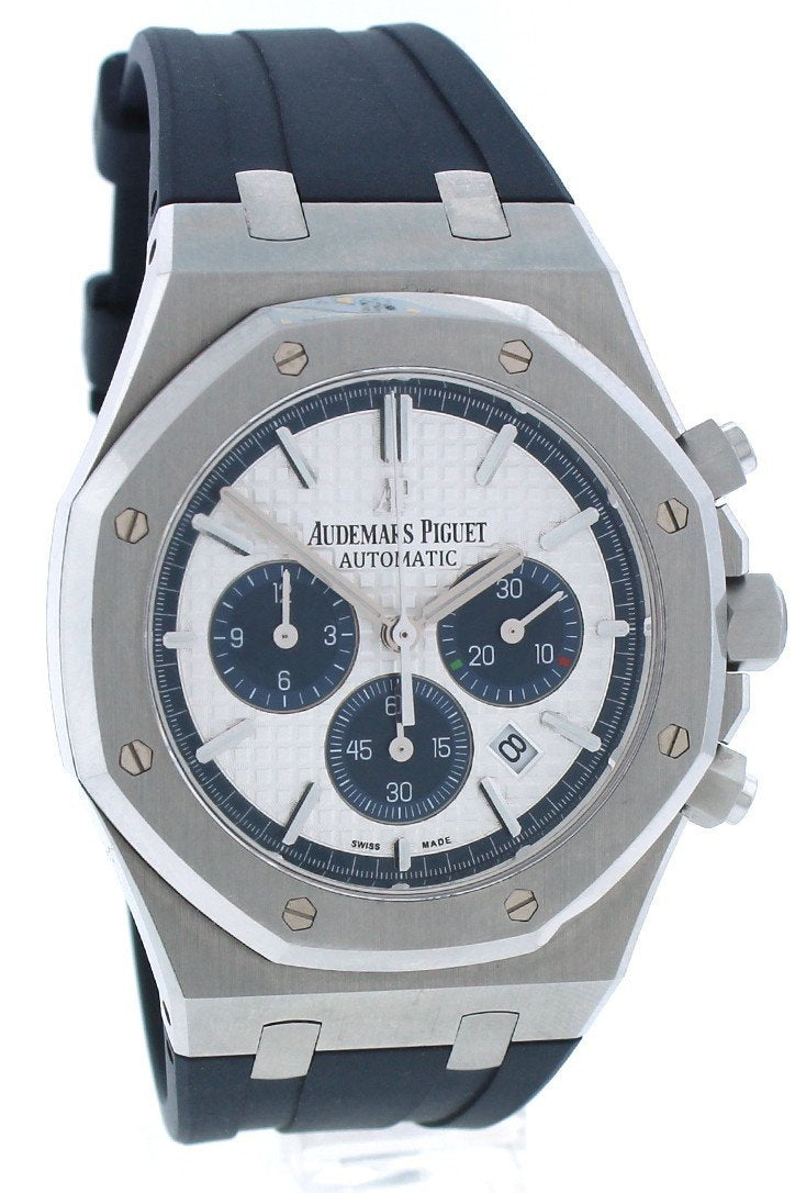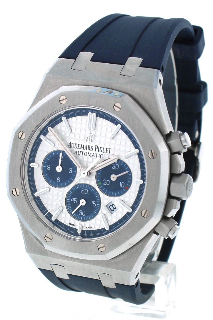 Stainless steel case with a blue rubber strap. Silver dial with silver-tone hands and index hour markers. Minute markers around the outer rim. Dial Type: Analog. Luminescent hands and markers. Date display between 4 and 5 o'clock position. Chronograph - sub-dials displaying: three - 60 second, 30 minute and 12 hours. Automatic movement. Calibre 2385 engine. Scratch resistant sapphire crystal. Screw down crown. Case diameter: 41 mm. Case thickness: 11 mm. Round case shape. Water resistant at 50 meters / 165 feet. Functions: chronograph, date, hour, minute, second. Additional Info: limited edition of 500 pieces. Luxury watch style. Watch label: Swiss Made. Audemars Piguet Royal Oak Silver Dial Automatic Mens Chronograph Watch 26326ST.OO.D027CA.01.