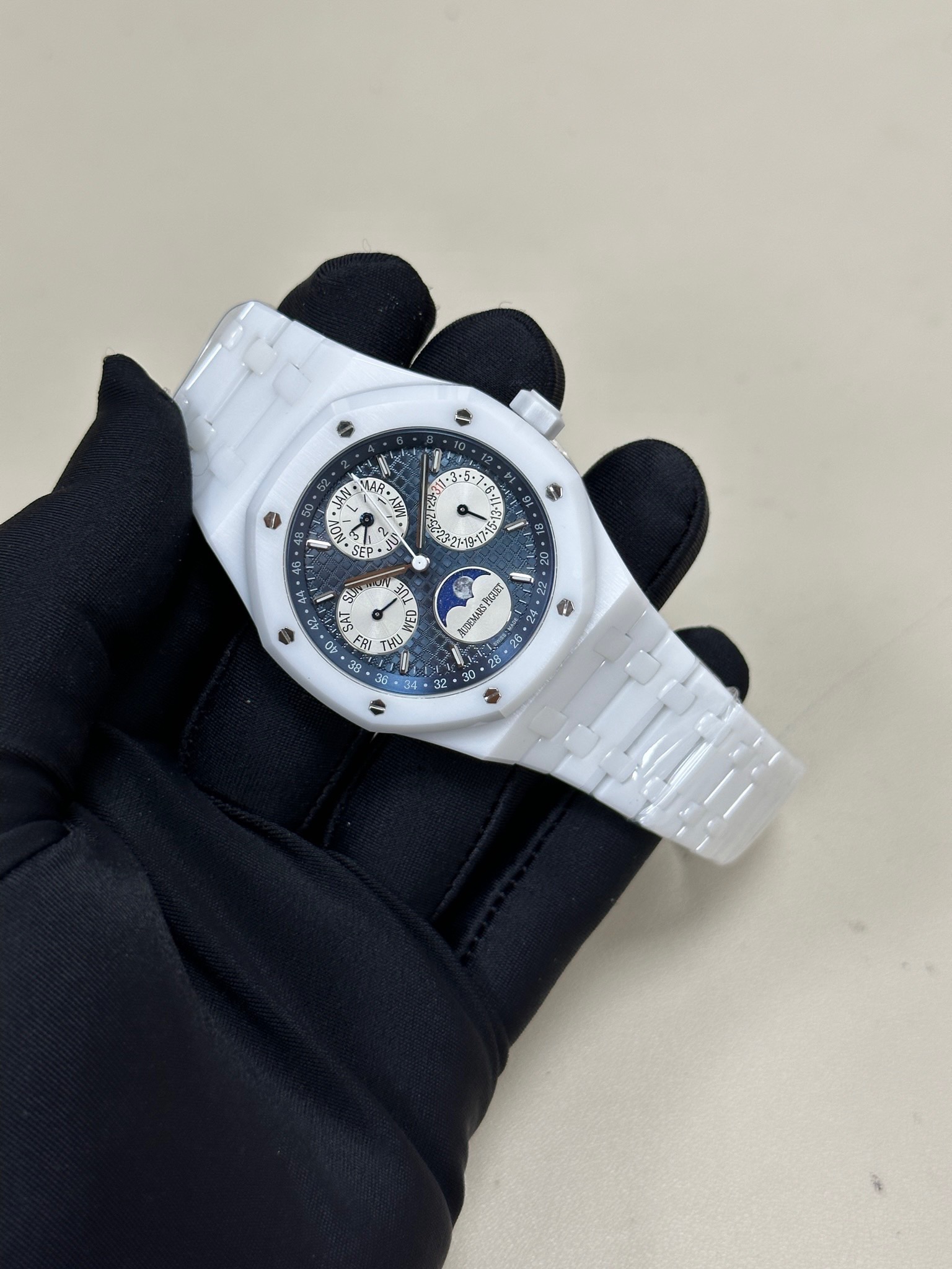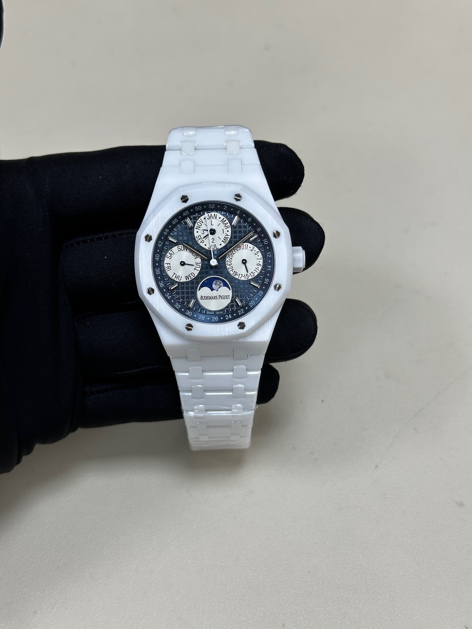 Super Clone Audemars Piguet Royal Oak 41 Prepetual Calendar blue Dial Automatic White ceramic Watch 26574OR.OO.1220OR.01