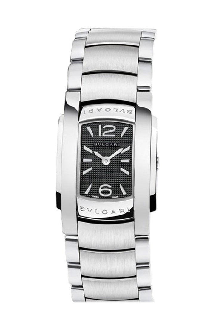 Stainless steel case with a stainless steel bracelet. Fixed bezel. Black dial with silver-tone hands and Arabic numeral and index hour markers. Dial Type: Analog. Quartz movement. Scratch resistant sapphire crystal. Pull / push crown. Solid case back. Case size: 35 mm. Rectangle case shape. Deployment with push button clasp. Water resistant at 30 meters / 100 feet. Functions: hour, minute. Luxury watch style. Watch label: Swiss Made. Bvlgari Assioma D Black Dial Stainless Steel Ladies Watch 101698 AA35BSS