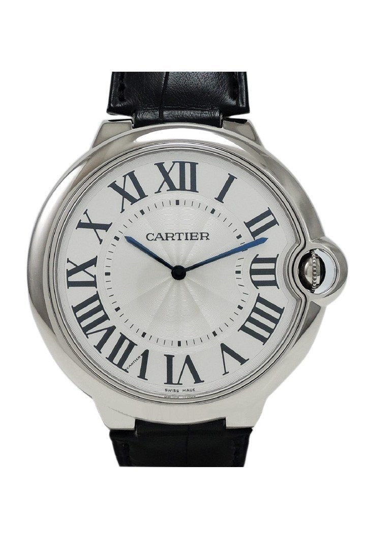 18kt white gold case with a black alligator-skin leather strap. Fixed 18kt white gold bezel. Silvered dial with blue sword-shaped hands and Roman numeral hour markers. Minute markers around an inner ring. Dial Type: Analog. Mechanical (manual wind) movement. Cartier 430 mc engine. Scratch resistant sapphire crystal. 18kt white gold crown with blue sapphire cabochon. Solid case back. Case diameter: 46 mm. Case thickness: 7.05 mm. 18kt white gold tang clasp. Water resistant at 30 meters (100 feet). Functions: hour, minute. Luxury watch style. Watch label: Swiss Made. Cartier Ballon Bleu de Cartier Extra-Large Watch W6920055.