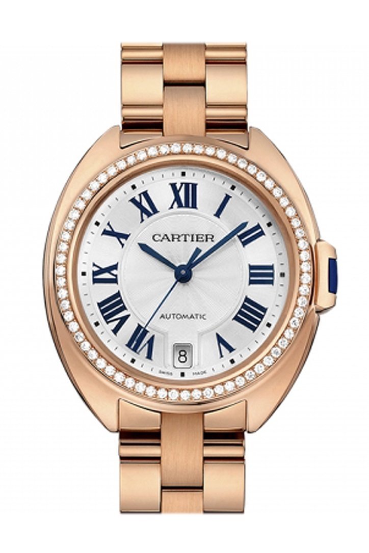 18 carat pink gold case with a 18 carat pink gold bracelet. Diamond set fixed bezel. Flinque sunray effect dial with blued steel hands and Roman numeral hour markers. Minute markers around the outer rim. Dial Type: Analog. Date display at the 6 o'clock position. Automatic movement. Scratch resistant sapphire crystal. Skeleton transparent exhibition see through case back. Case diameter: 35 mm. Case thickness: 10.09 mm. Round case shape. Water resistant at 30 meters / 100 feet. Functions: date, hour, minute. Luxury watch style. Watch label: Swiss Made. Cartier Cle Flinque Sunray Effect Dial Ladies Watch WJCL0006