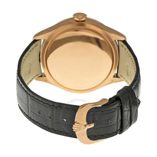18kt everose gold case with a black (alligator) leather strap. Fixed domed and fluted 18kt everose gold bezel. Black dial with rose gold-tone hands and index hour markers. Arabic numeral minute markers (at 5 minute intervals). Minute markers around an inner ring. Dial Type: Analog. Date display at the 3 o’clock position. Date subdials. Rolex calibre 3165 automatic movement, based upon Rolex 3130, containing 31 Jewels, bitting at 28800 vph, and has a power reserve of approximately 48 hours. Scratch resistant sapphire crystal. Screw down crown. Solid case back. Round case shape. Case size: 39 mm. Tang clasp. Water resistant at 50 meters / 165 feet. Functions: date, hour, minute, second, chronometer. Cellini Series. Luxury watch style. Watch label: Swiss Made. Rolex Cellini Date Black Dial 18kt Everose Gold Men’s Watch 50515BKSBKL.