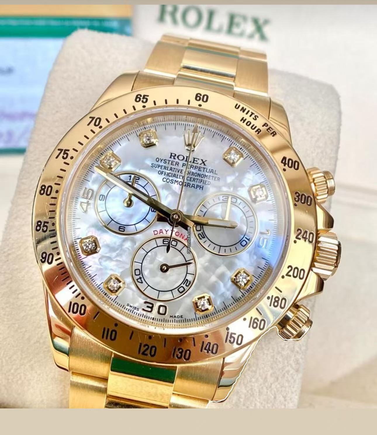 Cosmograph Daytona White Mother of Pearl Diamond Yellow Gold Oysterflex Strap Mens Watch