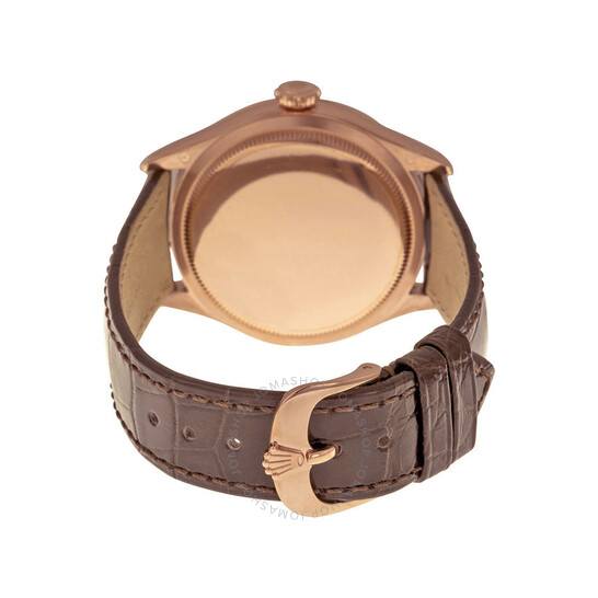 Rose gold-tone 18kt everose gold case with a brown leather strap. Fixed domed and fluted rose gold-tone 18kt everose gold bezel. White dial with rose gold alpha-style shape hands and index hour markers. Roman numerals appear at the 3, 6, 9 and 12 o’clock positions. minute markers around an inner ring. Dial Type: Analog. Rolex Calibre 3132 Automatic movement, based upon Rolex 3130, containing 31 Jewels, bitting at 28800 vph, and has a power reserve of approximately 48 hours. Scratch resistant sapphire crystal. Screw down crown. Solid case back. Round case shape. Case size: 39 mm. Tang clasp. Water resistant at 50 meters / 165 feet. Functions: hour, minute, second, chronometer. Luxury watch style. Watch label: Swiss Made. Rolex Cellini White Dial 18K Rose Gold Leather Men’s Watch 50505WSRL.